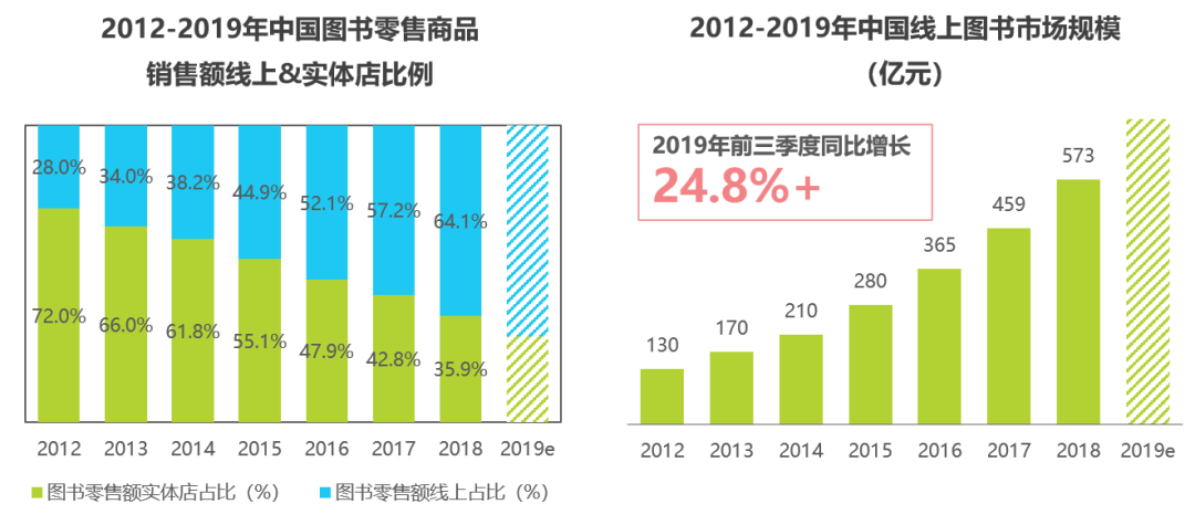 图书出版种数的丰富,意味着国民购书需求的进一步释放。在网购已成国民主要消费渠道的今天,线上图书零售额占比逐年提升,并于2016年实现反超实体店;2018年图书零售额线上占比达64.1%,市场规模573亿元,增长24.8%。而在2019年前三季度,图书线上零售额增速已超过24.8%,预计全年图书零售额线上占比将达到七成。