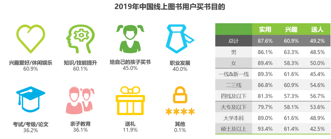 在其他媒介占据消费者时间越来越多的环境时,有购书需求和阅读兴趣的读者是越来越专业的一批人。据报告显示,中国图书网购消费者购书目的可分三大类,分别是实用、兴趣和送人。其中,有60.1%的人是为了知识/技能提升,有40.0%的人是为职业发展,有36.2%的人因考试/考级/论文,还有亲子教育的因素占36.1%;有45.0%用户是为了给自己孩子买书——合并分析来看,用户买书的主要目的是实用,占比87.6%;其次是兴趣,占比60.9%;最后是送人,占比49.2%。