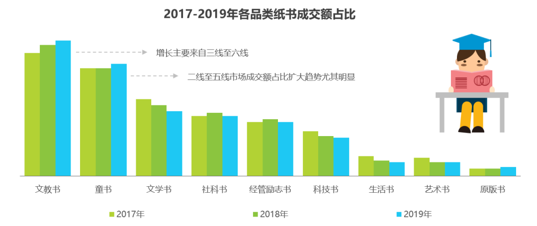 首先,纸书市场呈现出“三足鼎立”趋势,近三年文教书、童书和文学书三种图书类型稳居成交额前三。而之所以有此现象,与国家近年来在文教方面的政策息息相关。