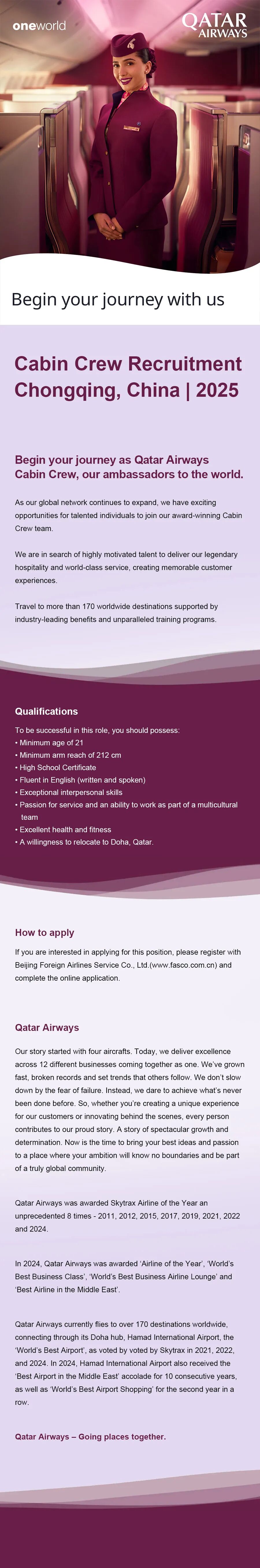 • 本次招聘不接受卡塔尔航空前空乘报名。