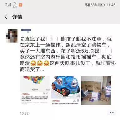 这起事件中,京东商城在接到家长反馈后,详细查看了客户订单,发现部分商品属于七天无理由退货范围,就引导客户在手机APP上操作了退货。另外有个别特殊商品,像投币摇摇车来自第三方商家,退货有一定困难,平台方面也主动出面帮忙沟通,协调退了货。这其实是一个负责任的、具有服务意识的平台,在处理类似“熊孩子”事件时的正确打开方式。