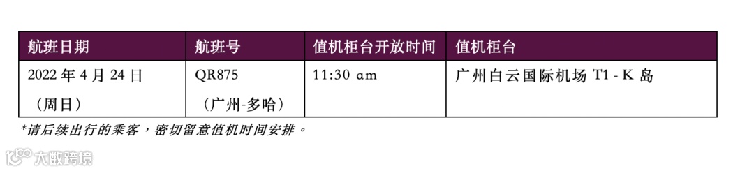 鉴于广州防疫管控升级等原因,卡航2022年4月24日(周日)广州-多哈QR875航班值机柜台将提前至当天上午11:30开放。为确保有充足的时间办理值机等相关事宜,请各位旅客务必携带健康码绿码以及48小时内核酸阴性证明提早到达机场。