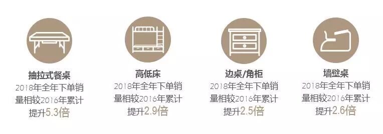 能够满足一物多用的多功能家具成为了新宠。抽拉式餐桌、高低床、墙壁桌、边桌/角柜等家具2018年全年下单销量相较2016年累计下单销量均有显著提升。
