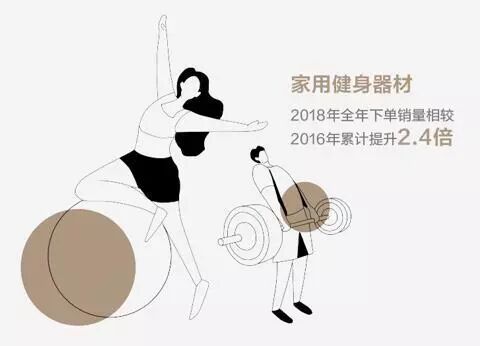 健身塑形随时随地,家用健身器材销量也稳步上升,2018年全年下单销量相较2016年累计提升2.4倍。其中,用户最爱购买的器械呈现两极化,依托于京东优质的物流服务,划船机、跑步机和椭圆仪这类重量较大的运动器械销量较高,而拉力器/臂力器和壶铃这种简单易上手、不占空间的小型运动器材也非常受欢迎。