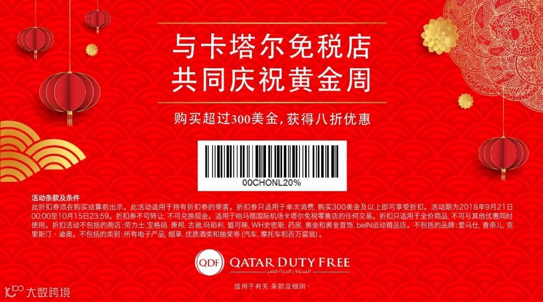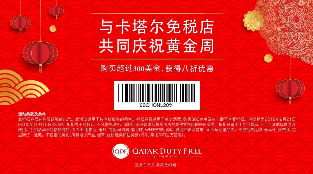 为庆祝中国国庆黄金周,自9月21日起至10月15日,卡塔尔免税店推出优惠促销券,凡在免税店内购买商品达300美金及以上的顾客,凭此优惠券即可获得8折折扣。在哈马德国际机场的卡塔尔免税店购物结账时,只需向工作人员出示这张带有条码的优惠卷,即可享受目前最大力度的折扣,从容带走喜爱的物品。