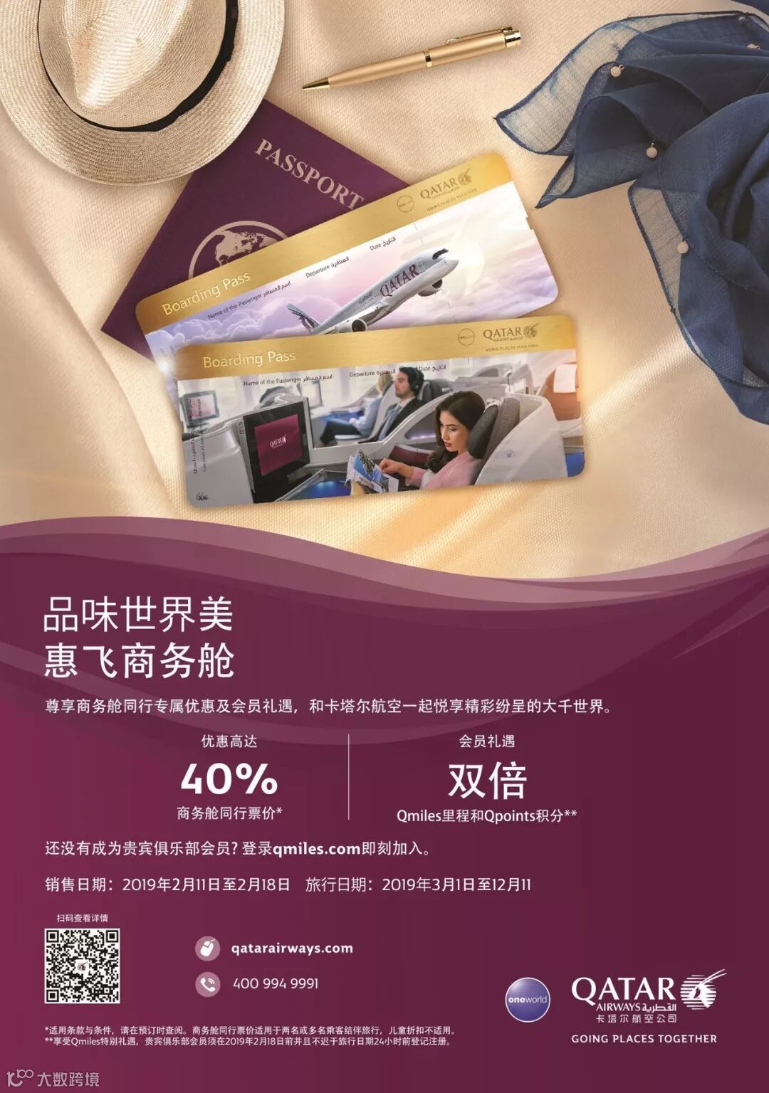 在2019年2月11至18日间购买卡航头等舱或商务舱机票,并在2019年3月1日至12月11日前出行,除了超划算的折扣外,贵宾俱乐部(Privilege Club)会员还能获得双倍Qmiles里程和Qpoints积分奖励!