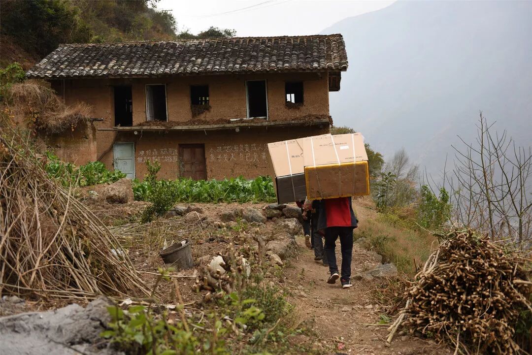 不过现在,到达鹦哥村后,还需要把大小家电一个个背上肩膀,踩着一条铺满石头的羊肠小道,再和一起送货的小伙子一个替换着一个,轮流背着一步一步往山上爬才能送到家里。