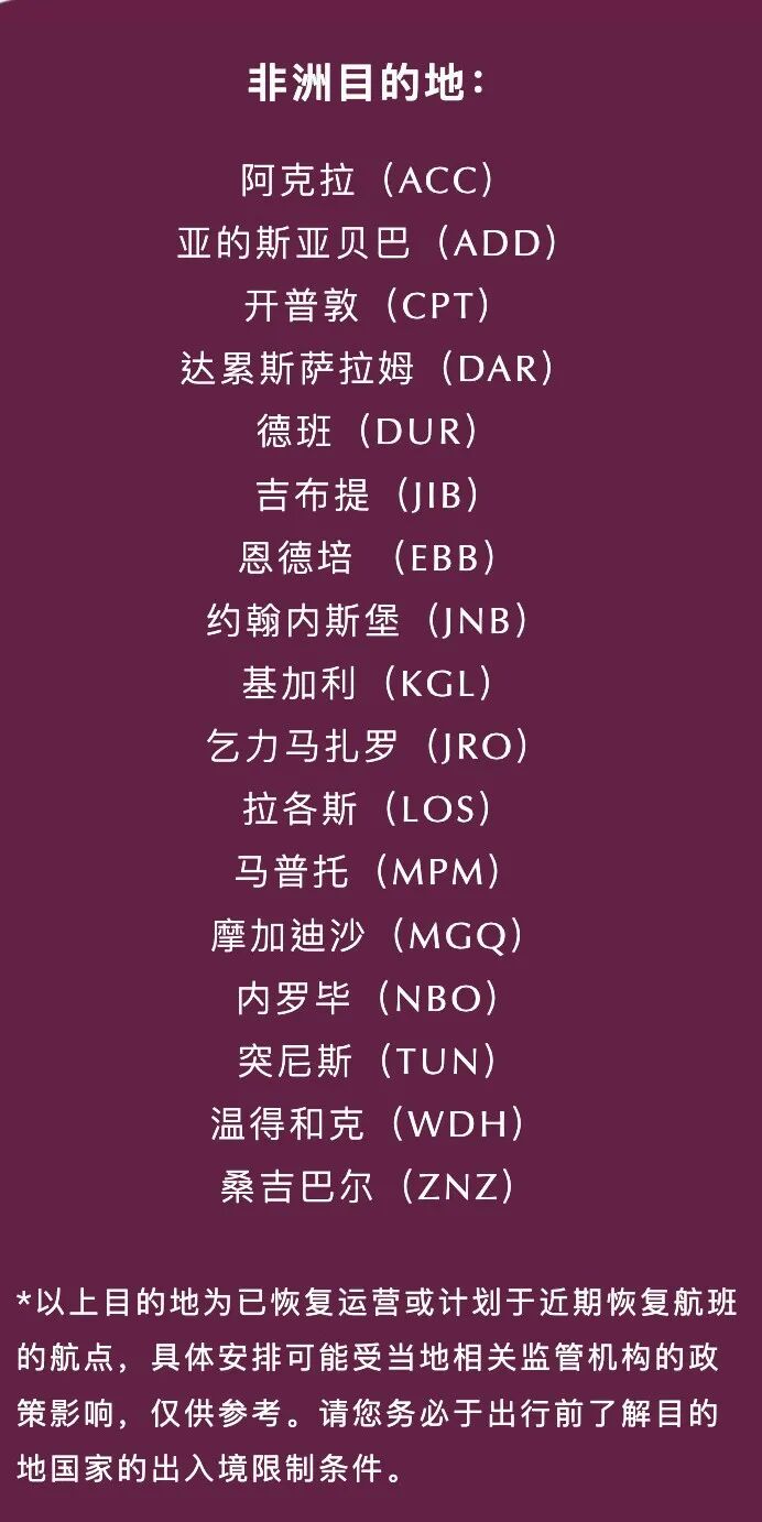 更多飞往非洲各大城市的航班信息及最新订票优惠,欢迎点击【阅读原文】进入官网了解更多。卡塔尔航空感谢您在特殊时期对我们工作的谅解与支持!