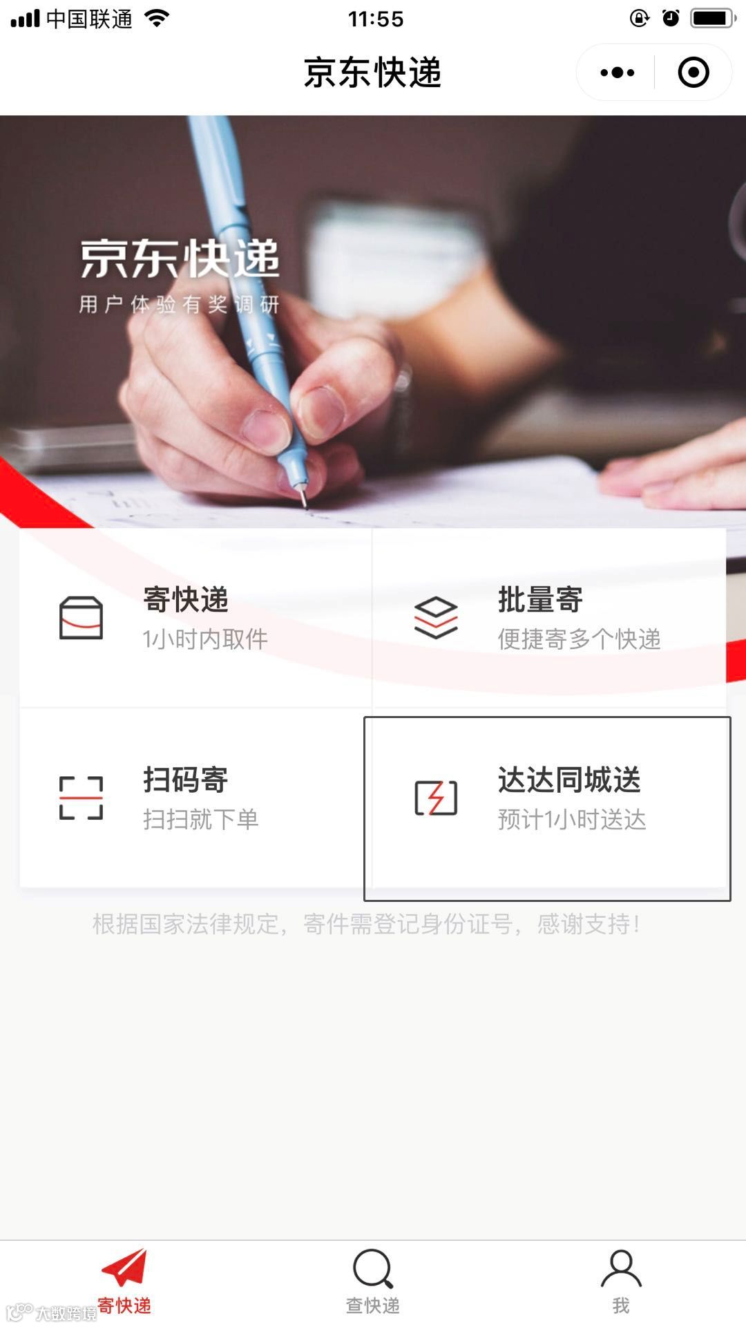 同期,京东快递小程序首页上线了同城送入口,可寄送物品包括文件、食品饮料、鲜花、蛋糕、水果生鲜、数码家电、服饰鞋帽等。消费者也可通过京东小哥微信公众号下单。