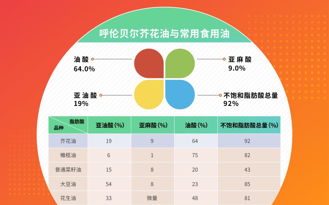 ▲ 呼伦贝尔芥花油与常用食用油的对比,不饱和脂肪酸含量达92.8%
