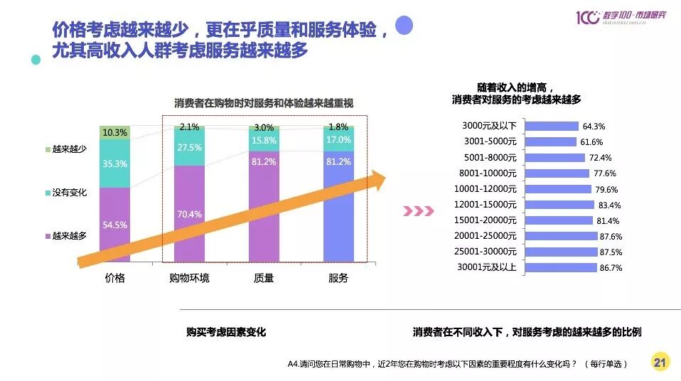 调研结果显示,在各项零售服务中,1小时生活圈成为最受消费者追捧的服务,服务型产品和产品使用周期内的保障服务受重视程度紧随其后。从人群来看,高收入和高知人群在消费过程中对价格的敏感度越来越低,但对于服务的重视程度越来越高,月收入2万元以上的人群中超过85%的人表示更重视消费过程中的服务。