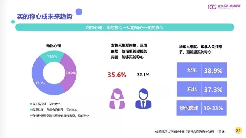 有正品保证,会买的放心;选择多,有合适的推荐,会买的省心;商品极大丰富后,有更多服务选项和多方位的服务保障,才能买的称心。报告显示,消费感受的三个进阶阶段分别为放心、省心和称心,目前已有35.6%的女性进入消费的高阶阶段,希望在消费中能得到更多的服务保障,达到称心消费体验。此外,调研发现,华东和东北的消费者在消费体验的需求上走在前列,分别有38.9%和37.3%的人希望能在消费过程中得到更多的服务,买到称心。