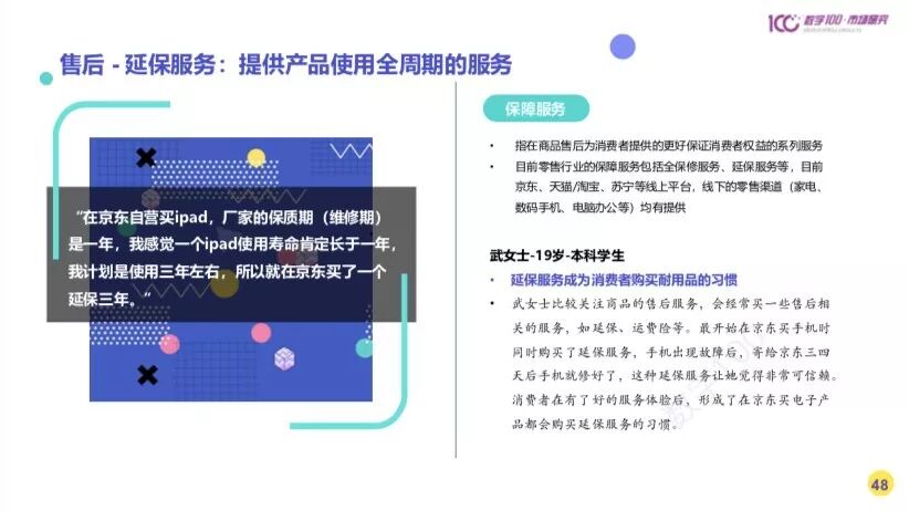 19岁的大学生武姑娘说:“我比较关注商品的售后服务,会经常买一些售后相关的服务,如延保、运费险等。之前刚在京东自营买了一个iPad,正常的保修期是一年,我自己对这个iPad的使用计划是3年左右,所以在下单的时候我同时选择了一个3年延保的增值服务。”