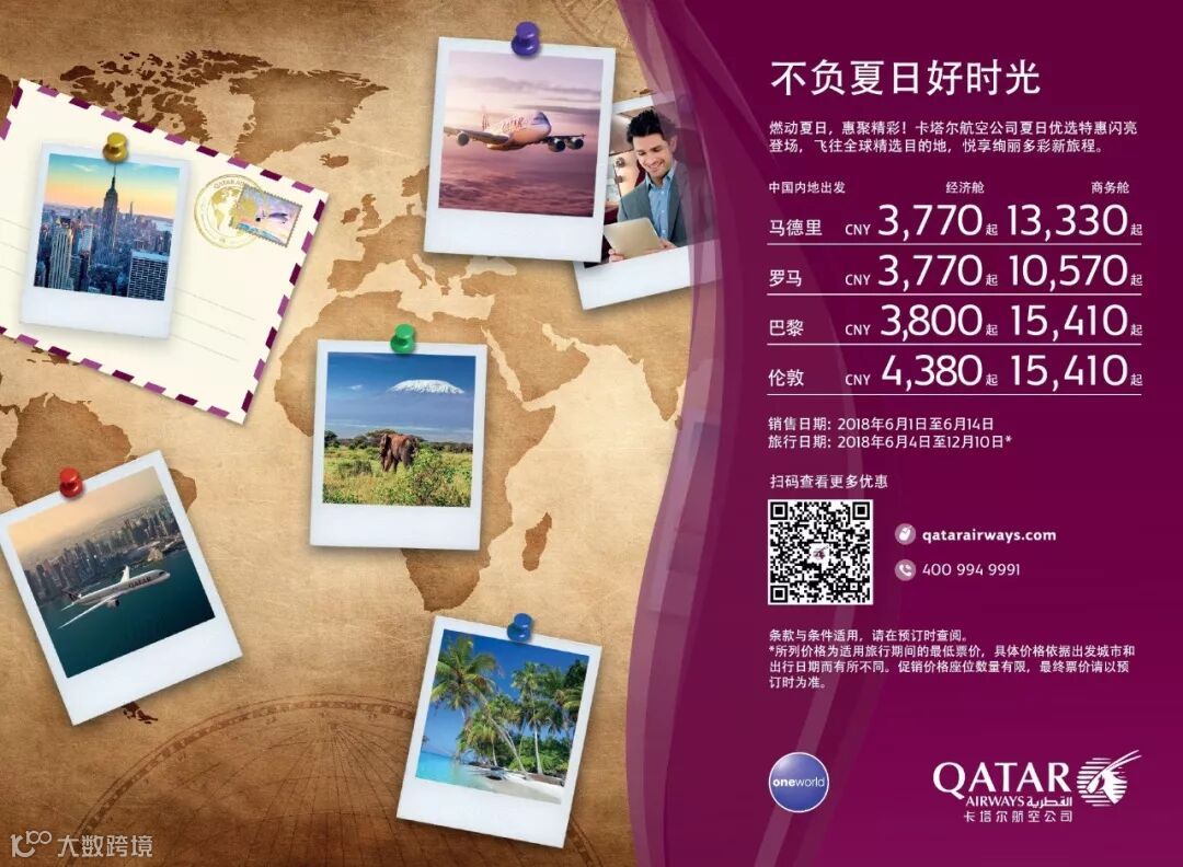 即日起至2018年6月14日,预订卡塔尔航空中国六大城市出发往返欧洲目的地机票,经济舱人民币3,670元*起,商务舱10,570元*起。