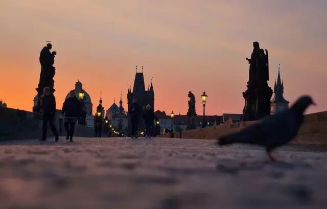 布拉格的清晨闪耀着温暖的光芒,熙熙攘攘的人群和成群结队的白鸽将城市唤醒。