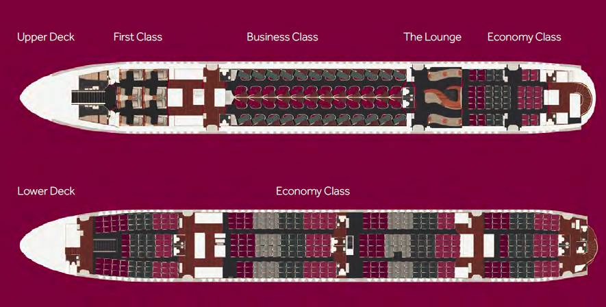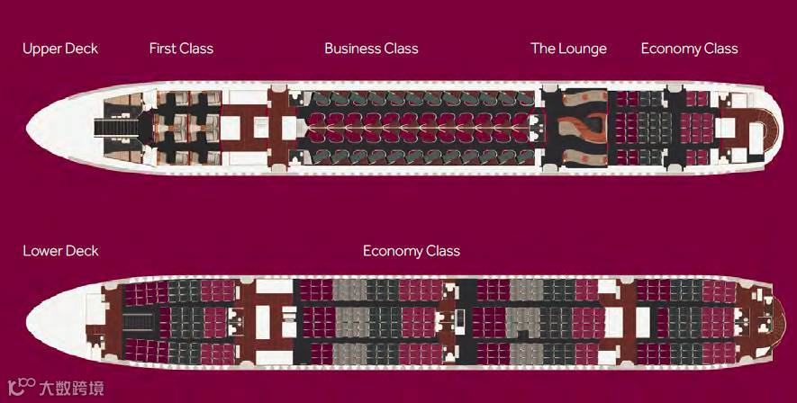 我们还有上下两层的独立宽体客舱,8个头等舱、48个商务舱以及461个经济舱。所有舱位的座椅都经卡塔尔航空携手知名设计师与制造商特别定制~