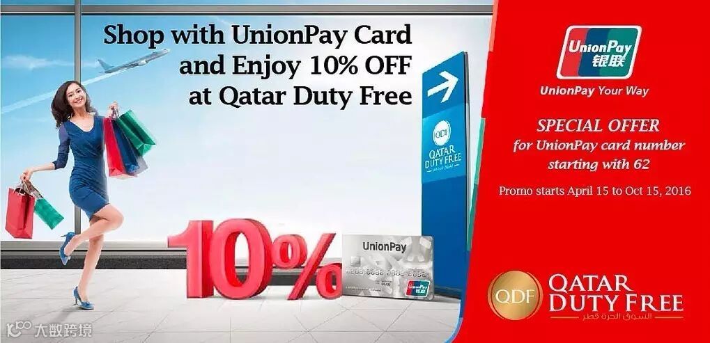 从2016年4月至10月15日,银联国际持卡人(UnionPayInternational)在小卡的大本营--哈马德国际机场免税店(DQF)购物可享受9折优惠!