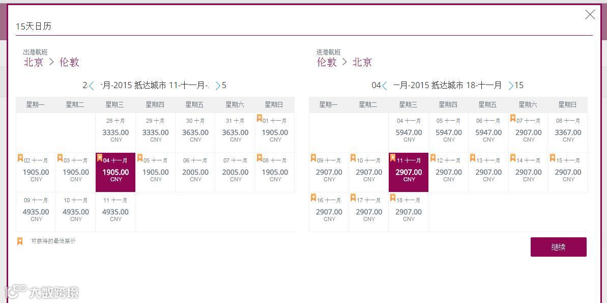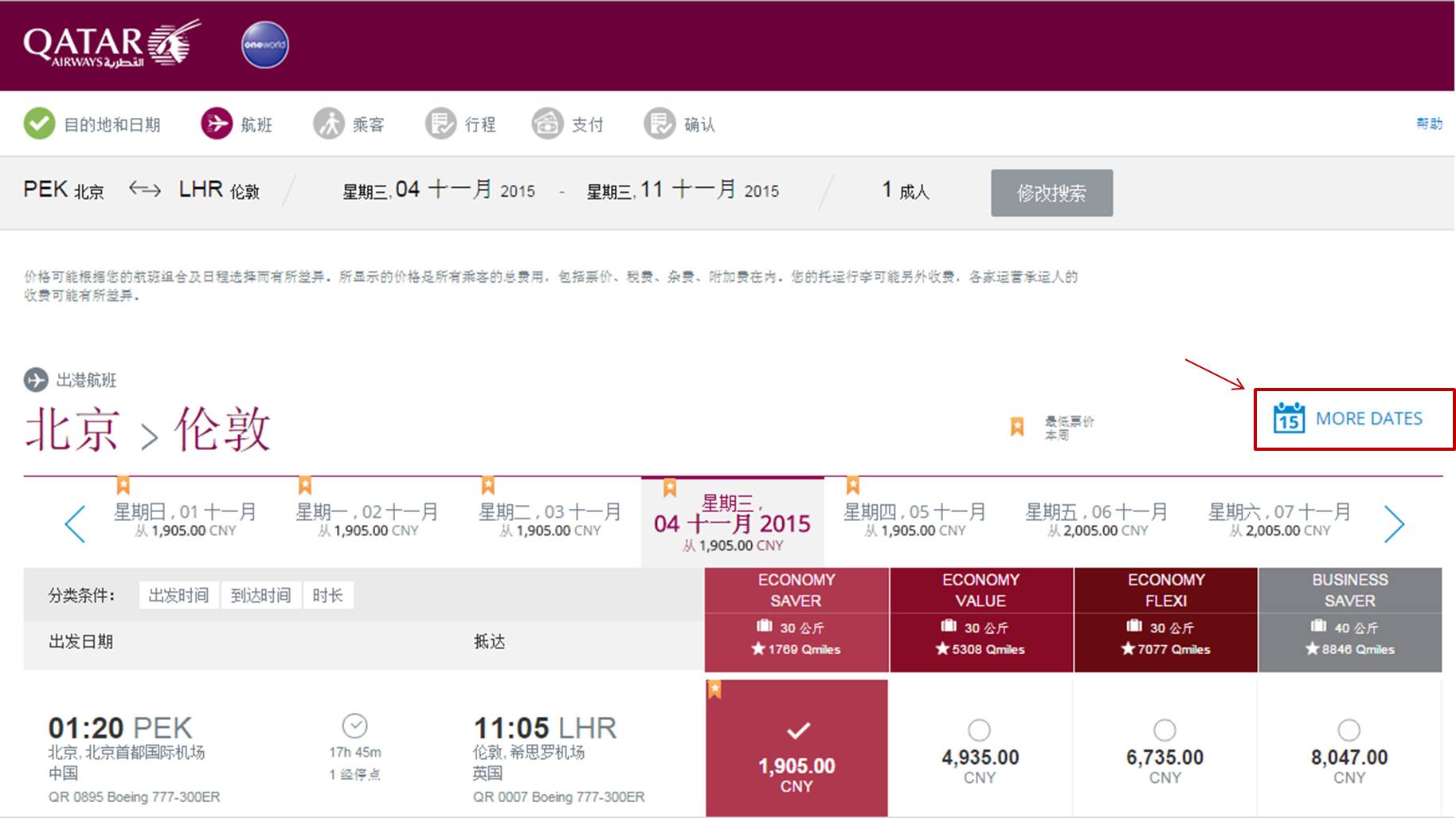 此外,预订机票时还可以通过点击“MOREDATES”来查看近15天所有选定航线的航班价格,方便大家在购买机票时进行选择和对比。