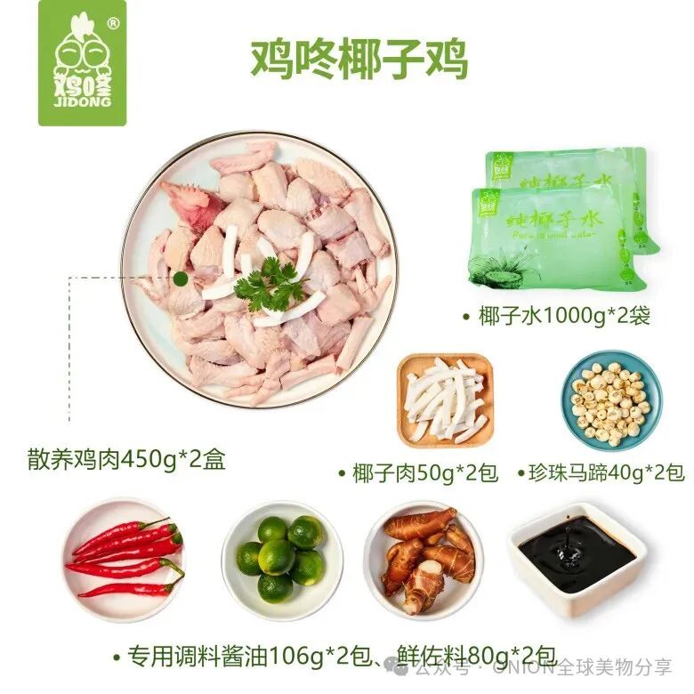 鸡肉450g*2盒,椰子水1000g*2袋,椰子肉2包,珍珠马蹄2包,专用调料/辅料2包