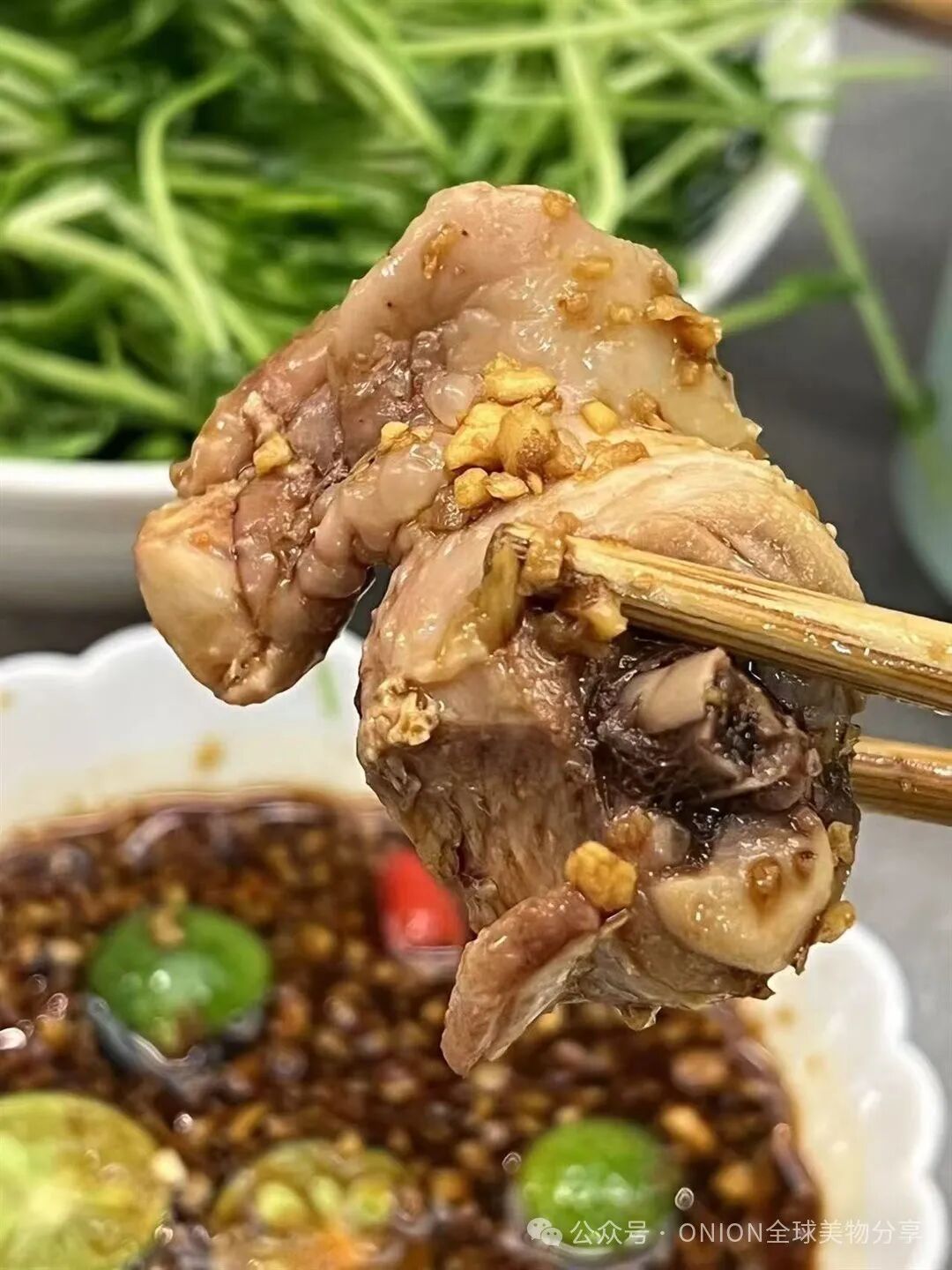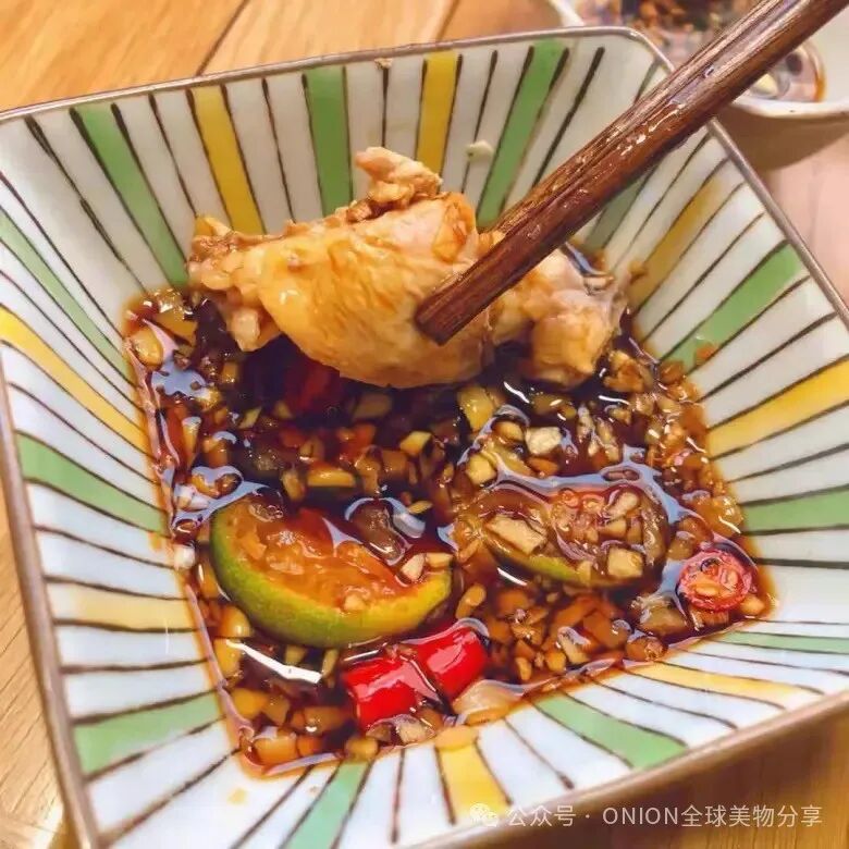 夹着鸡肉轻沾,鲜尝一口,味蕾炸裂!
