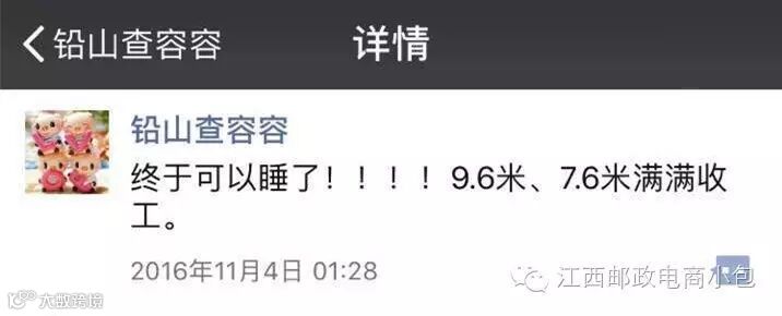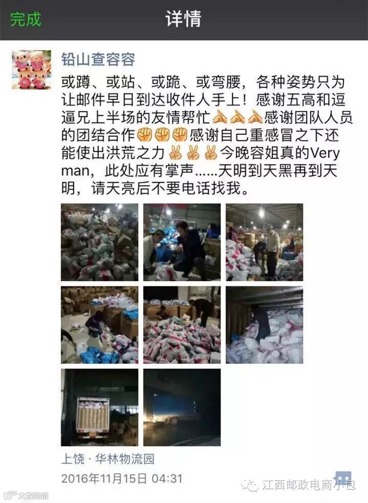 11月4日,铅山县收寄快递包裹超1.8万件,9.6米和6.8米的货车装得满满的,这是铅山县收寄量破历史记录的一天,直至凌晨1点半才把邮件装好,并将数据正常发送出去,看着邮车师傅离开,查容容才带着已经躺在办公室长椅上睡着的孩子回家。