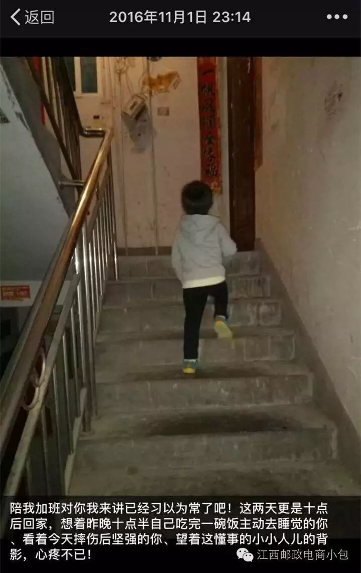 11月6日,孩子的父亲也加班无法回家,一大早查容容就把孩子送去了”惠夫人”仓库让同事帮忙照看,便赶往南昌处理因无收寄信息滞留在南昌邮区中心局的邮件。途中收到同事拍过来的照片,查容容内心充满了愧疚,出发前宝宝还交待她开车注意安全,早点回家!