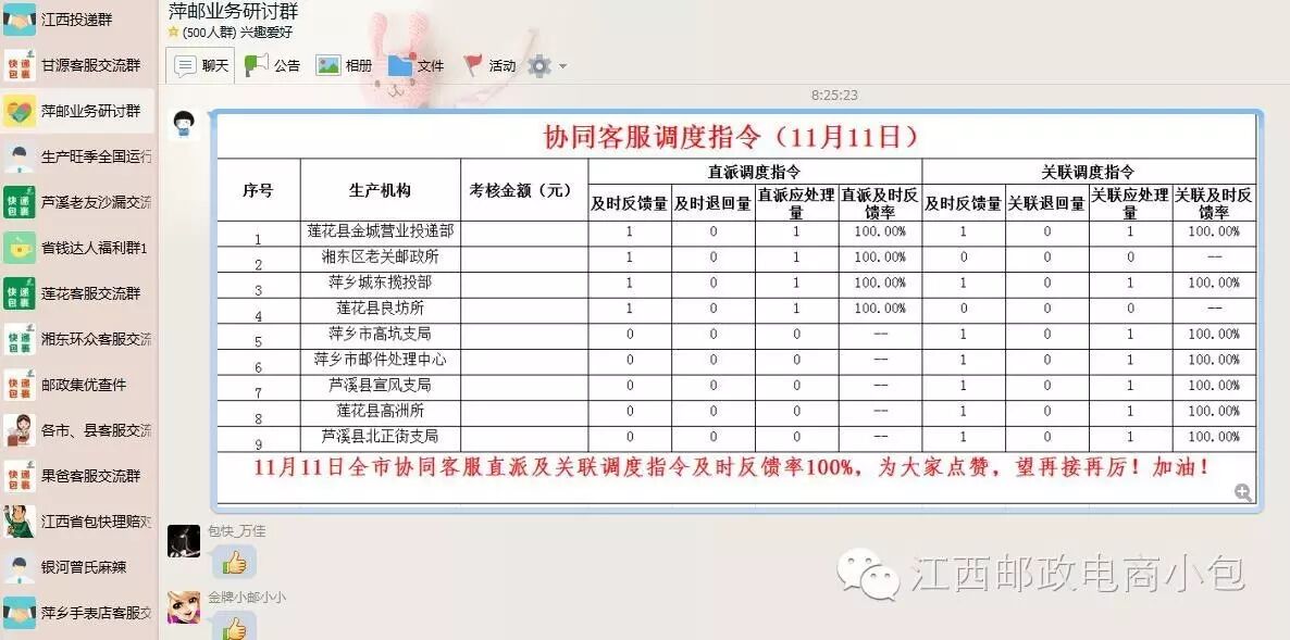 “双11”期间,小邮们采用两小时电话通知、群通报,每日工单明细通报、每日反馈率通报等方式督办全市11183工单298条,反馈及时率达97.98%。