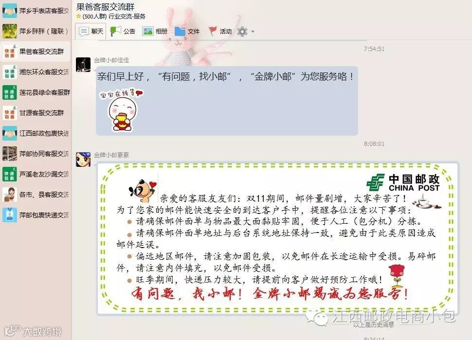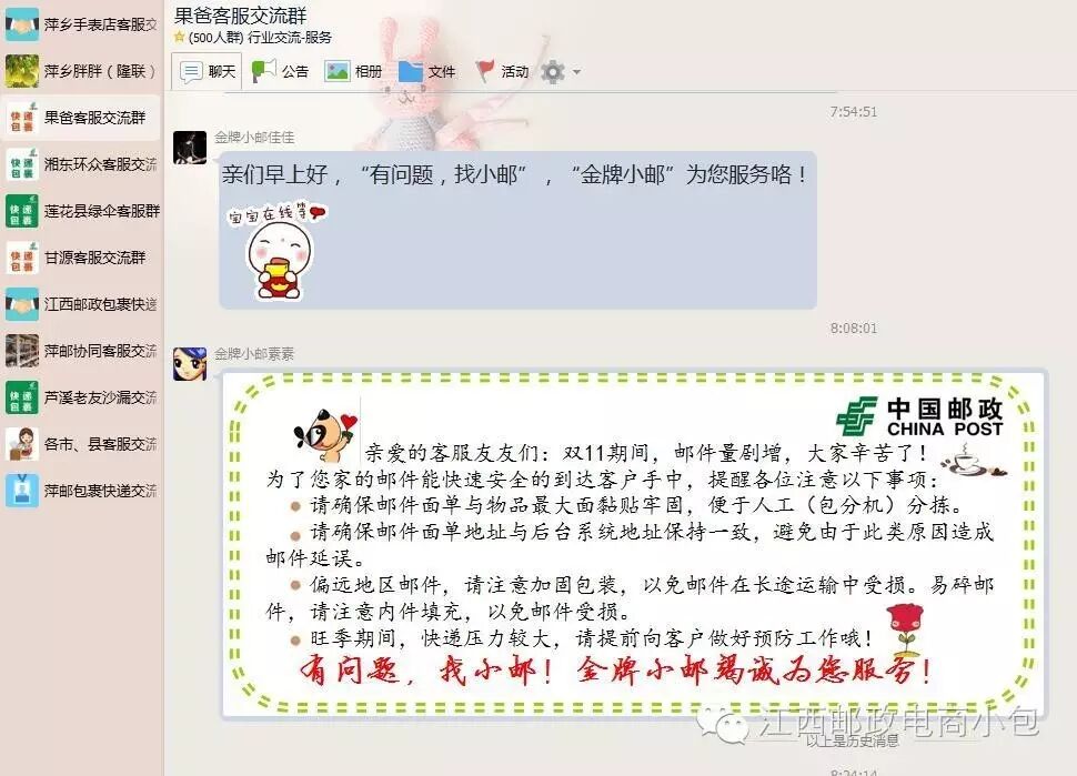 “双11”期间,小邮们提前以温馨提示的方式问候客户,并提醒旺季期间注意事项等,减少由于细节问题导致的客户投诉。