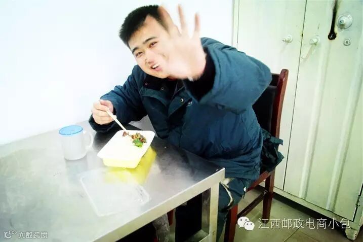 (“双11”期间,王良中午1点多才归班,随手买了份快餐计划在营揽投部的办公室里吃完了继续去投递,看见同事上前拍照,娇羞地挥手说“别拍别拍”)