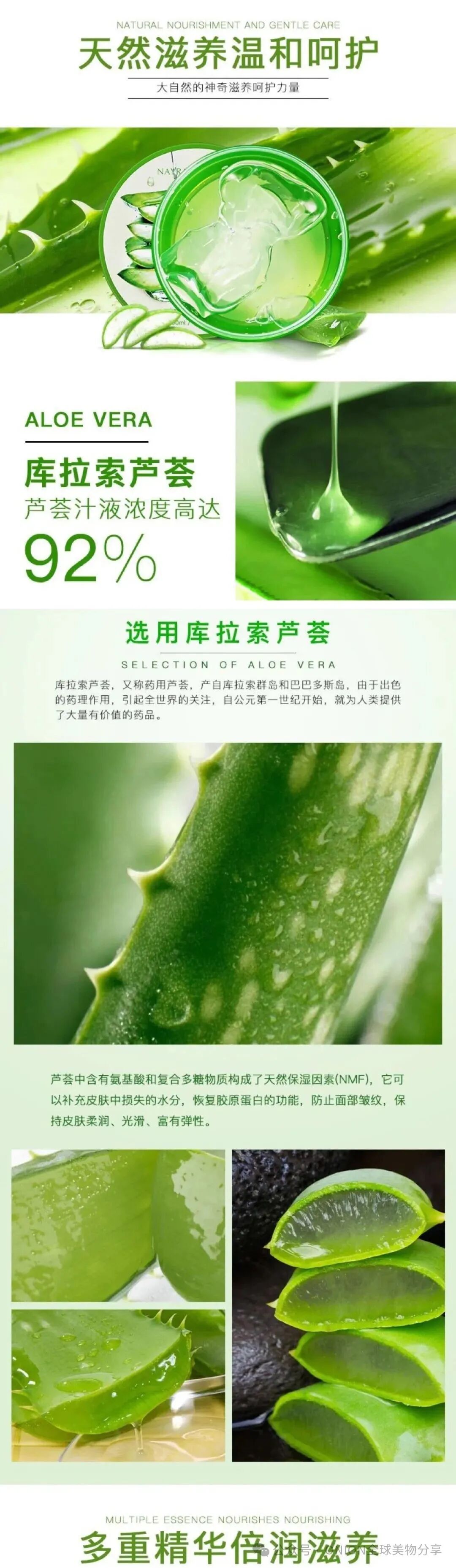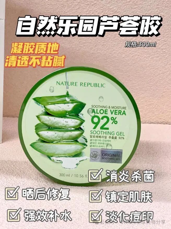 ✔️镇静和舒缓肌肤的功效,对于因环境因素或肌肤问题引起的肌肤不适,如红肿、瘙痒等,自然乐园芦荟胶都能发挥出色的舒缓作用。芦荟中的活性成分能够迅速作用于肌肤表面,帮助肌肤降温、缓解不适感,让肌肤恢复到健康状态~