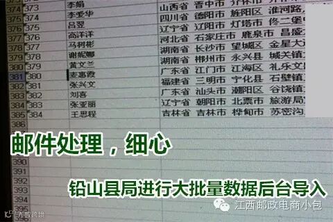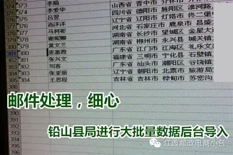 在收寄环节,铅山县局采用“热敏面单打印+大批量数据后台导入”的方式,购买扫描枪进行数据匹配,自行研究出一套大批量数据导入处理流程,并编制成《邮政小包大宗导入处理流程手册》,共享给全市使用(目前铅山已有两个小包大户采用此方式进行收寄)。
