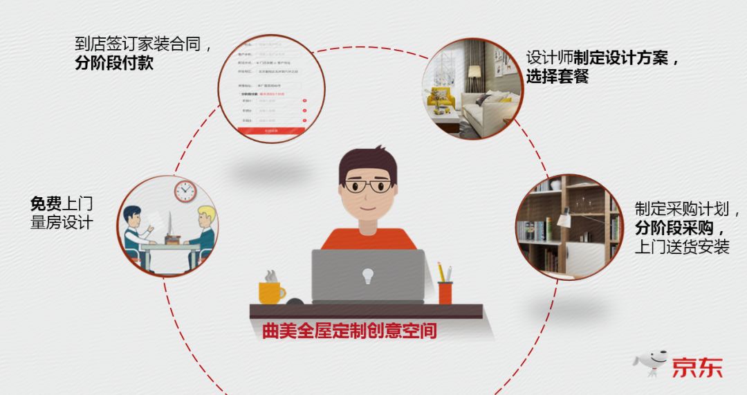 对商家来说,可通过京东万家系统支持门店在系统中维护家装定制套餐方案,例如整装1899元/平米的样板间套餐。通过万家系统的套装管理功能,门店可自由管理本店的样板间套餐。通过对供应链进行整合,套装中可加入来自京东供应链的商品,也可加入曲美供应链的定制商品,共同组成与门店样板间对应的线上样板间套餐方案。客户到店后,门店与客户沟通家装方案,门店设计师完成客户定制方案的设计,定制方案中的商品可来自样板间套装,也可直接从京东商品池中挑选商品最终组成用户的定制化方案。