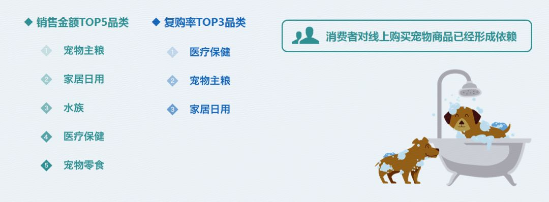 随着宠物经济市场的蒸蒸日上,围绕着宠物从出生到死亡的整个过程,已形成了一条包括宠物培育、宠物交易、宠物食品、家居日用品、医疗保健、宠物美容、宠物培训、宠物保险等一系列商品和服务的“宠物链”。数据显示,目前以医疗保健为代表的专业服务已领衔复购率TOP3品类。