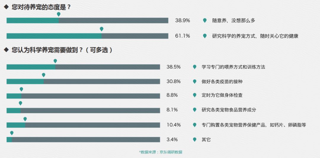报告显示,超过60%的消费者会选择研究科学的养宠方式,随时关注它们的宠物健康;接近40%的消费者会学习专门的喂养方式和训练方式;30.8%的消费者会给爱宠做好各类疫苗的接种。
