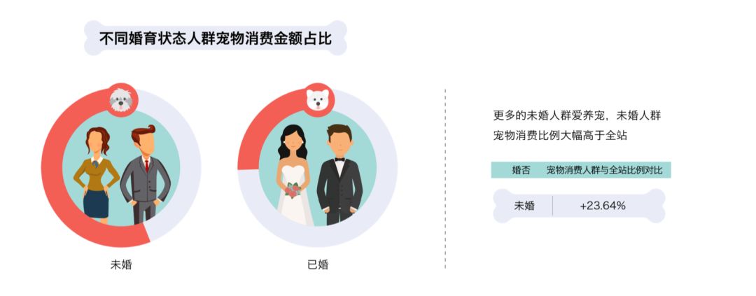 此外,随着城镇化进程推进带来的人口结构的巨大变革,空巢青年和晚婚晚育人群逐年增多,养宠情感需求逐步上升。在某种意义上,宠物充当了生活中伴侣的角色。相对的,未婚人群对待宠物所花费的心思和金钱,也多得多。