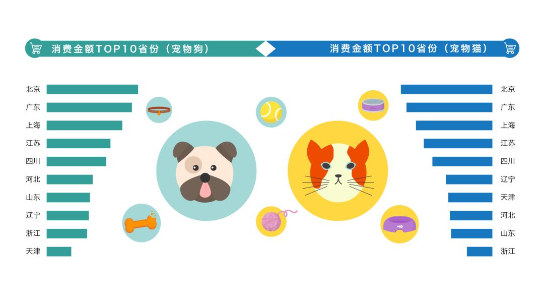 在地域方面,在消费金额TOP10省市榜单,北京、广州、上海、江苏和四川在狗和猫宠物消费方面均为主力消费大省。