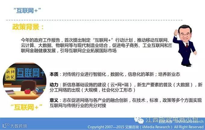 报告数据显示,今年的政府工作报告,首次提出制定“互联网+”行动计划,推动移动互联网、云计算、大数据、物联网等与现代制造业结合,促进电子商务、工业互联网和互联网金融健康发展,引导互联网企业拓展国际市场。志在促进网络与各产业的融合创新,在技术,标准,政策等多个方面实现互联网与传统行业的充分对接。