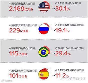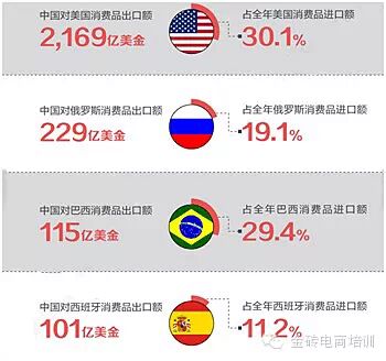 接着,据统计,2013年中国消费品出口总额超过了1万亿美元。在全球1000亿美金的贸易总额中,中国就占了300亿美金。预计在2018年可以增长到1600亿美元。可见,中国的跨境电商是一个非常有潜力的行业,是以后的发展趋势。那么,又有哪些国家最爱进口中国消费品呢?下面就看看图片的统计: