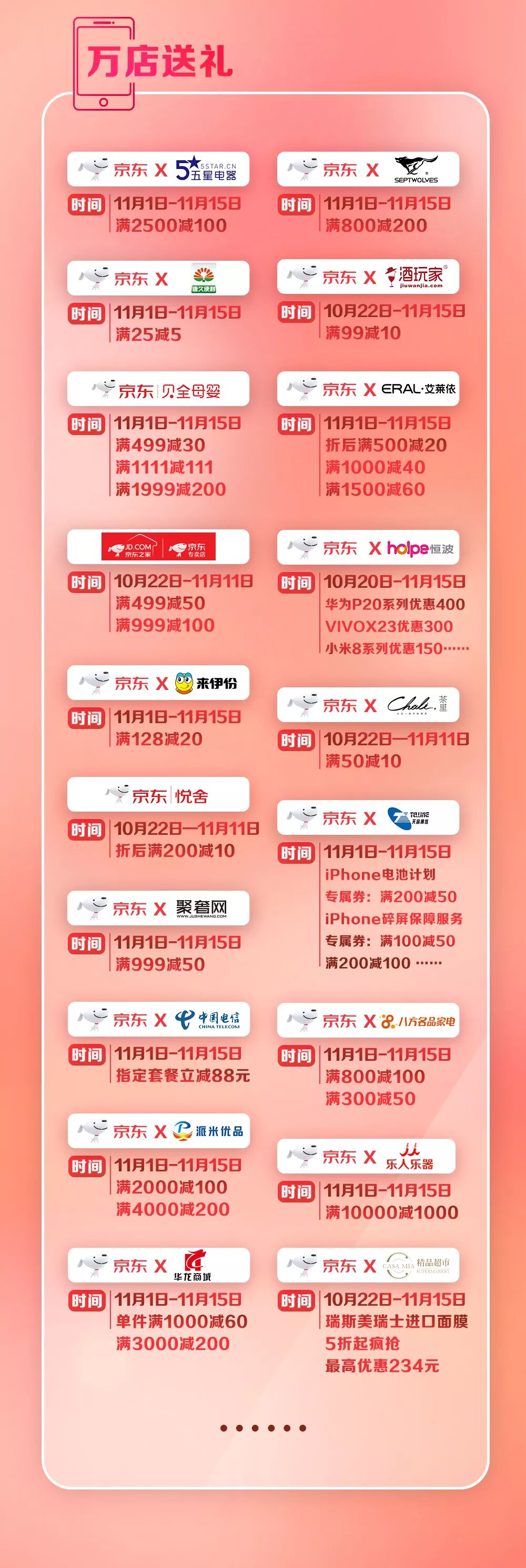 各个品牌的优惠力度空前。比如中国电信指定套餐立减88元;恒大和方面,华为P20系列优惠400元、VIVOX23优惠300元、小米8系列优惠150元;七匹狼满800减200;京东之家满499减50、满999减100……