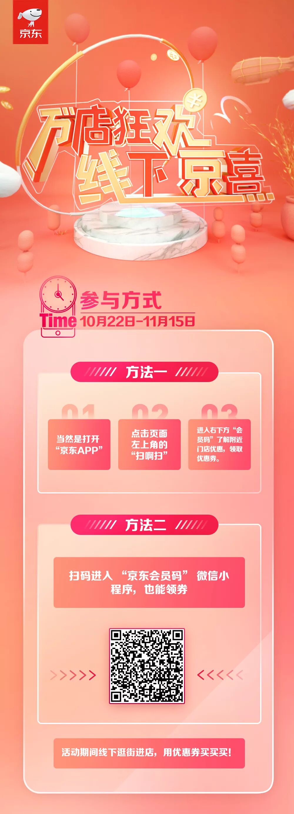10月22日至11月15日,登陆“京东会员码”小程序或手机京东—扫啊扫—会员码频道,你就会发现有不少你身边的商店有促销活动,点击领取优惠券后,你就可以在活动期间到相应的门店购物,尽情享受优惠券折扣。