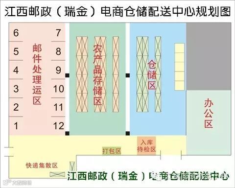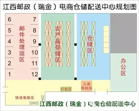 仓储中心分为八个主要功能区和3个辅助功能区,八个功能区分别是:工业品下乡区、农产品进城区、“农村e邮”村站包裹处理区、城区包裹处理区、邮政包裹处理区、“农村e邮”农副产品仓储区、新鲜果蔬仓储区、食品检验区;辅助功能区为农副产品打包区、蔬果打包区、食品抽检区。