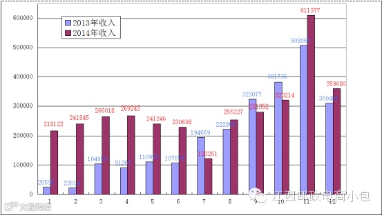 南昌县邮政局2013年与2014年每月国内小包收入对比图