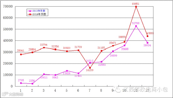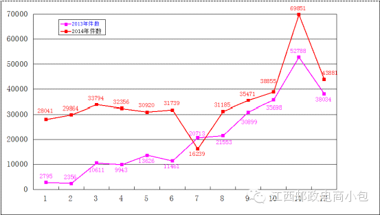 南昌县邮政局2013年与2014年国内小包每月接件对比图