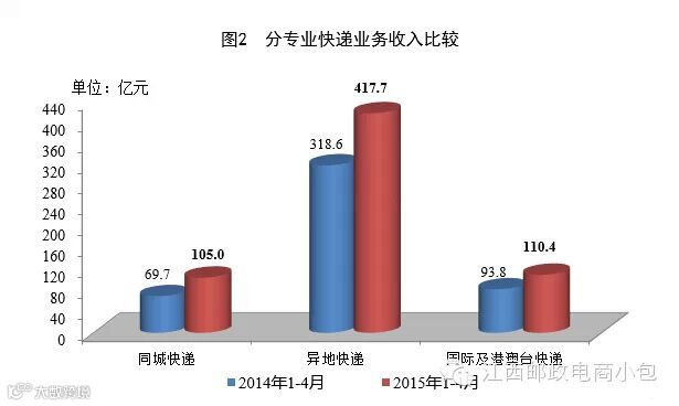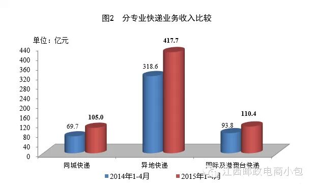 1-4月,同城、异地、国际及港澳台快递业务收入分别占全部快递收入的13.9%、55.3%和14.6%;业务量分别占全部快递业务量的26.4%、71.4%和2.2%。与去年同期相比,同城快递业务收入的比重上升1.7个百分点,异地快递业务收入的比重下降0.6个百分点,国际及港澳台业务收入的比重下降了1.9个百分点。