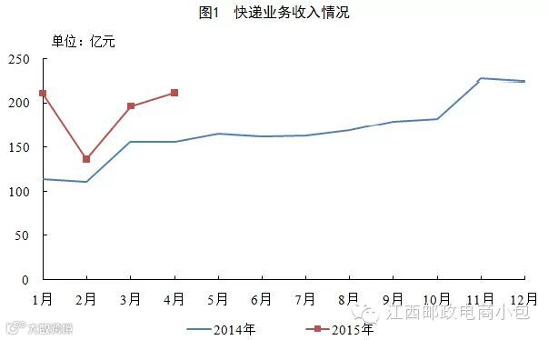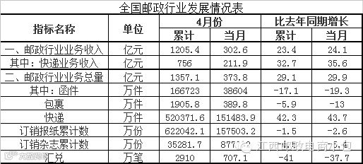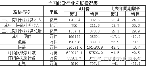 4月份,全行业业务收入完成302.6亿元,同比增长24.1%;业务总量完成373.8亿元,同比增长29.9%。