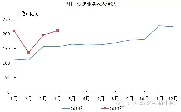 1-4月,邮政企业和全国快递服务企业业务收入(不包括邮政储蓄银行直接营业收入)累计完成1205.4亿元,同比增长23.4%;业务总量累计完成1357.1亿元,同比增长29.1%。