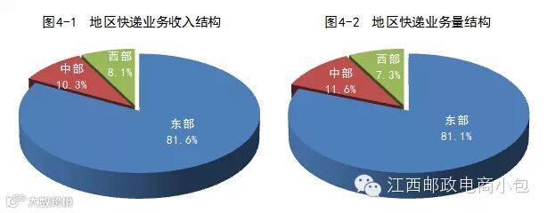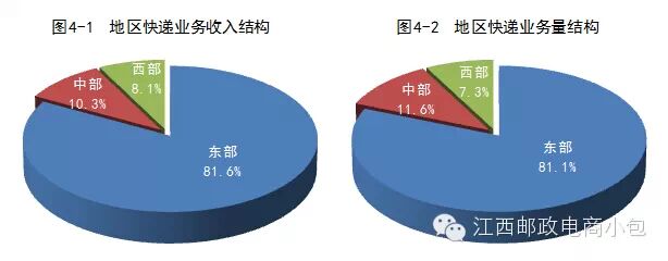 1-4月,东、中、西部地区快递业务收入的比重分别为81.6%、10.3%和8.1%,业务量比重分别为81.1%、11.6%和7.3%。与去年同期相比,东部地区快递业务收入比重下降了1个百分点,快递业务量比重持平;中部地区快递业务收入比重上升了0.7个百分点,快递业务量比重上升了0.5个百分点;西部地区快递业务收入比重上升了0.3个百分点,快递业务量比重下降了0.5个百分点。