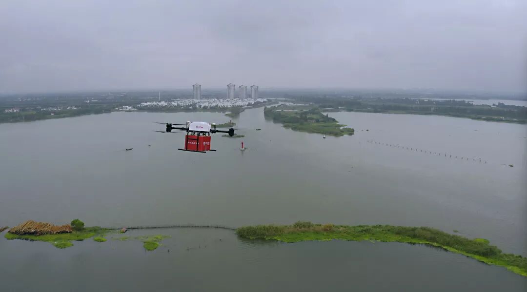 ▲京东无人机翱翔于阳澄湖上
