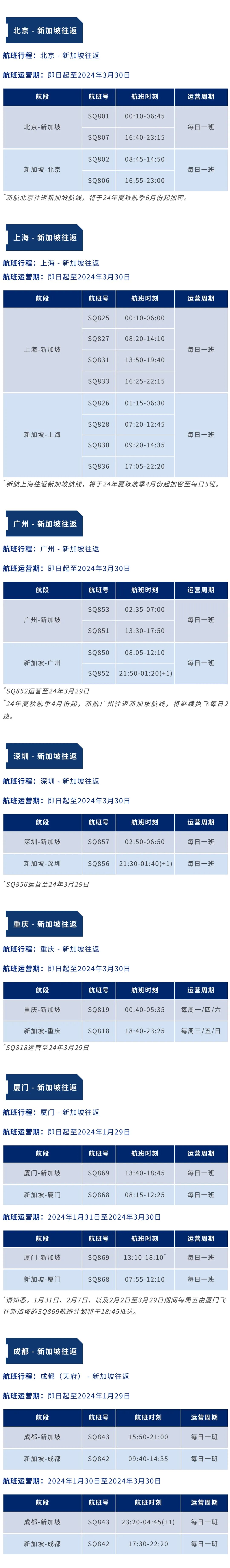 此次航班加密及新增后,至2024年3月30日,新航将运营每周80班中国内地往返新加坡航线,具体航班时刻如下(以下时刻均为当地时间)。
