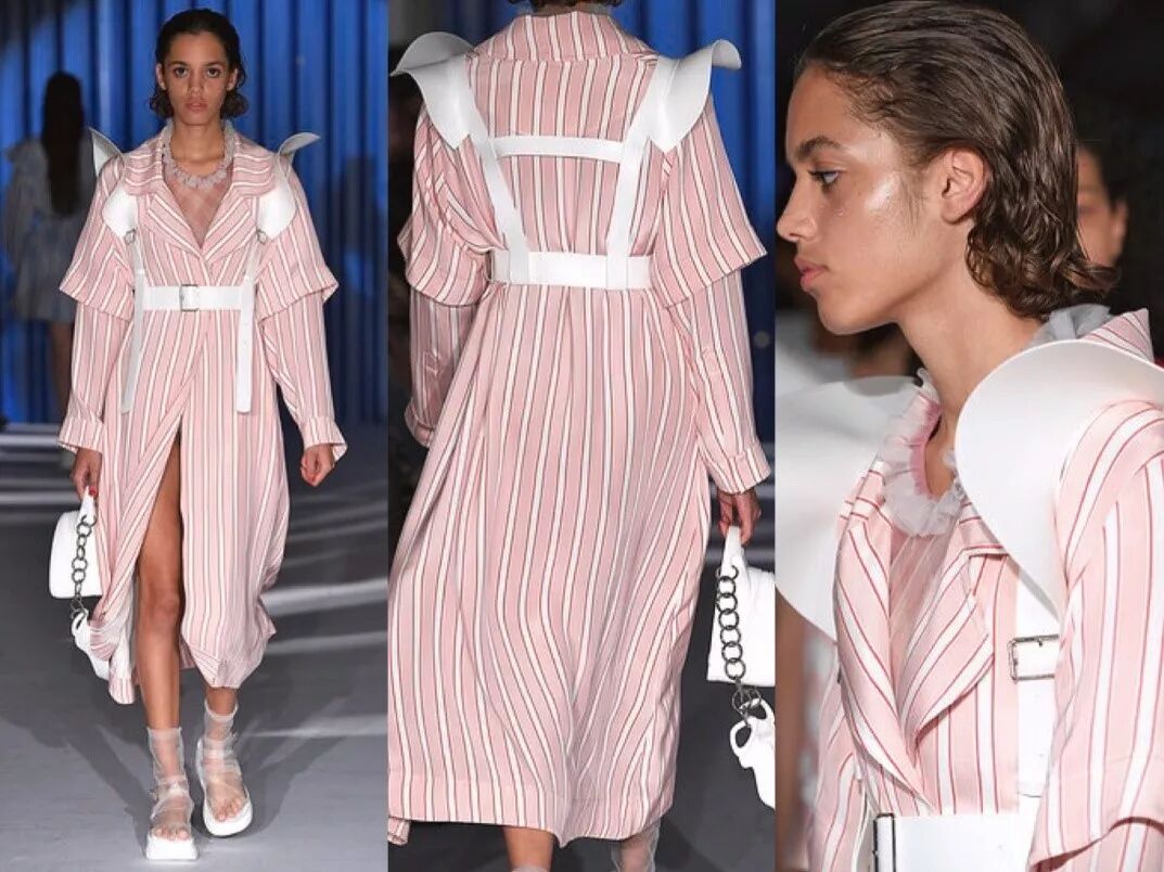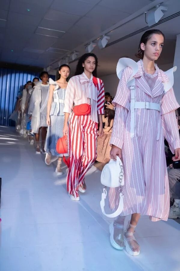 XIAO LI2019春夏系列大秀尤其令人瞩目。她的作品灵感来源于美丽的海岛毛里求斯,通过色彩与面料的碰撞,表现悠闲舒适的海边生活。海洋元素贯穿作品始终,采用了大量的黄白、蓝白条纹、泳衣设计以及飘带等。